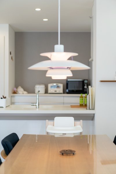 ひとつひとつの家具がステキ!シンプルゆえに、ご主人こだわりのペンダントライトがオブジェのように映えますね。キッチンは対面式を採用。お子さんの様子を見守りながら、庭の景色を眺めながら、家事ができる間取りになっています。