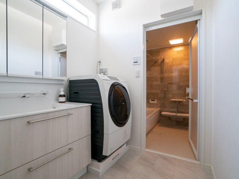 脱いだ後の衣類はそのまま洗濯機へ。ランドリールームとキッチンが近くに配置されているので、洗濯機を回しながら、お風呂や食事の準備も一挙にできて効率的です。高窓から降り注ぐ陽の光が壁や床に反射して、まるで間接照明のような柔らかな明るさ!