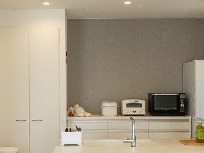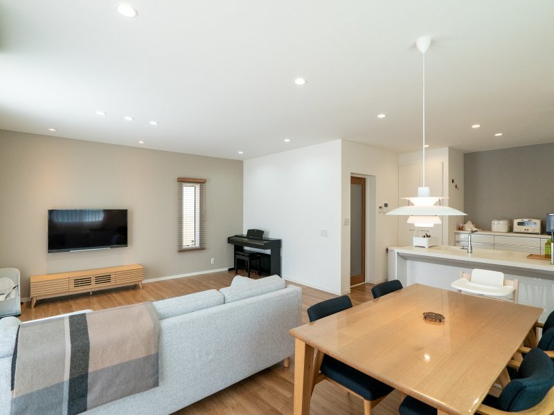見た目でこだわったのは、白を基調にしたシンプルな空間づくり。外観も内観も白を基調にコーディネートされ、床や家具に木目を取り入れることで、温もりをプラスしています。ここで注目したいのは、空間にメリハリを生んでいるグレージュの壁。奥さまが大好きな色だそう。