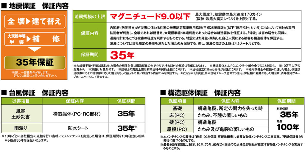百年住宅では、地震や台風によって、全壊・半壊した場合でも35年間保証いたします。