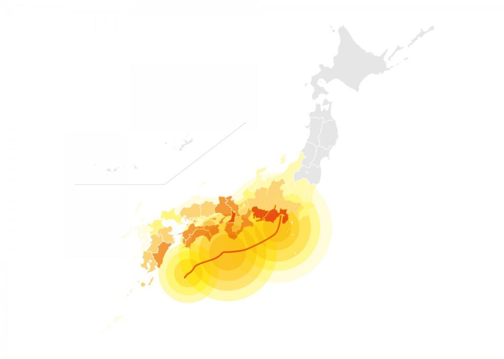 地震が発生すると、震源域が広範囲にわたるため、東海地方〜九州地方にかけての太平洋沿岸部で強い揺れと津波が発生します。