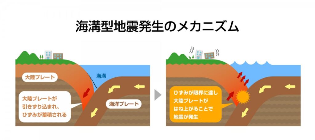 沈み込みによって大陸プレートが引きずられ、限界に達すると一気に跳ね上がり、巨大地震が発生します。