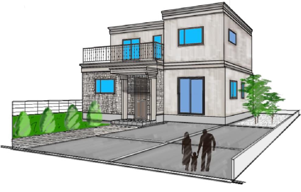 トラディショナルなClassicデザイン。何年経っても変わらない、美しい西洋の街並みを彷彿させるファサード。手摺はクラシカル調PC又はロートアイアン外壁は玄昌石とフラットパネル、モールディングのコンピネーション。