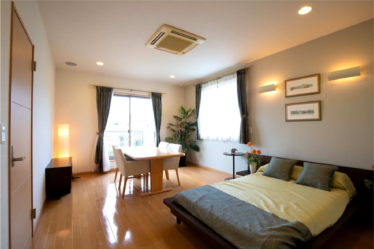 主寝室は広々としたいという方にはモデルになるお部屋になります。こちらの展示場では、ダイニングテーブルをおいていますが、こちらにソファーとテレビを置く方も多いですよ!夜のひと時をご夫婦でお酒を飲みながら過ごすのも素敵な時間ですね♪