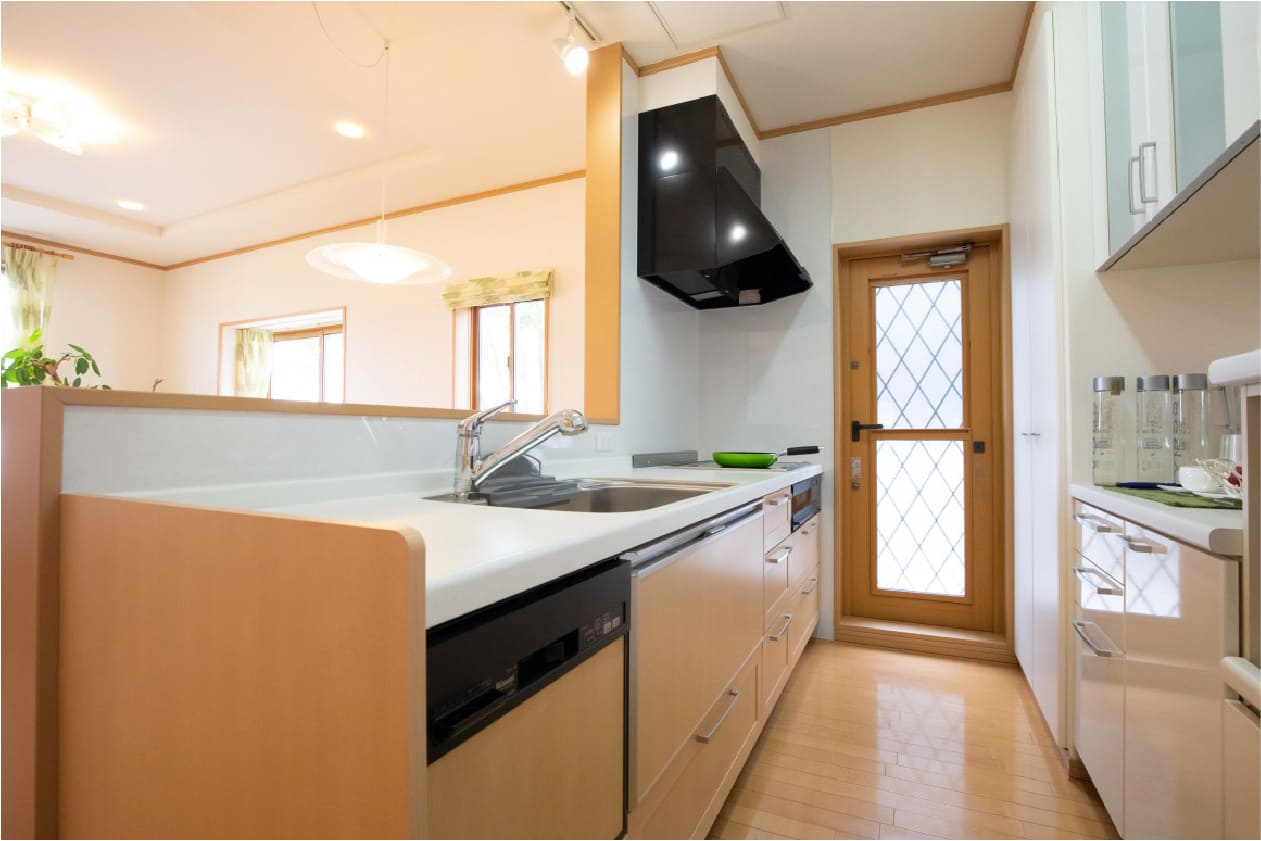 キッチンはオシャレにしたいけど収納もたっぷり欲しい!という方に向けてキッチンを設計しています。また、照明や日の光の差し込みにもこだわり。いつでも明るい空間を演出。奥様にとってとっておきな空間だからこそいつも明るくキレイなキッチンを保ちたいですね♪