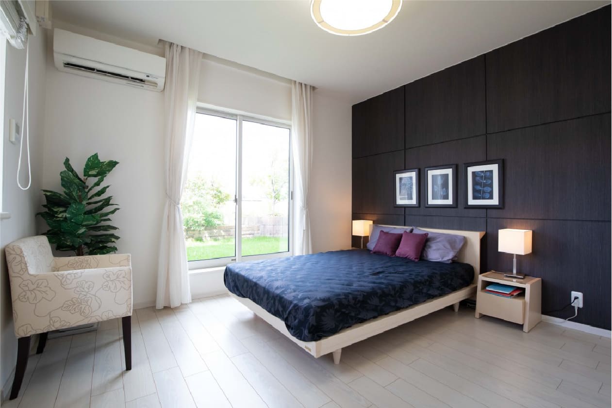寝室は寝るだけだから・・・とあきらめていませんか?百年住宅の強みは2階でも庭園をつくることが出来ることです。朝起きてカーテンを明けたら目の前に芝生!そんな贅沢が簡単に叶ってしまう嬉しい寝室です。壁紙を1面だけ変えて上質な空間をだしています。
