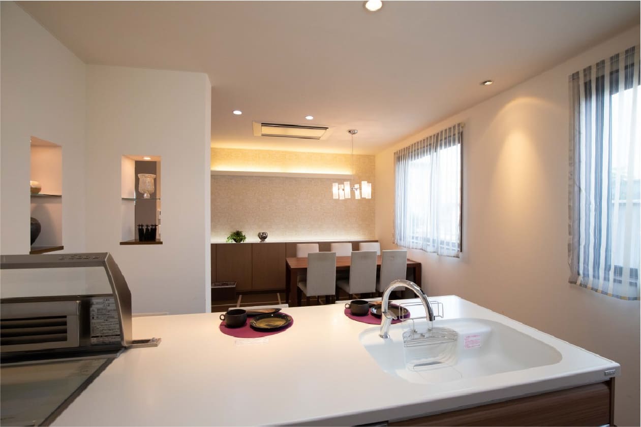 三島第一展示場でこだわわっているのが、カウンター付きキッチンです。お子様の宿題を見ながらお料理が出来るだけでなく、最近お客様から聞いたのは、お子様が寝た後の真夜中にこちらのカウンターでラーメンを食べる事が増えたことで夫婦の仲が高まったという声もいただきました。