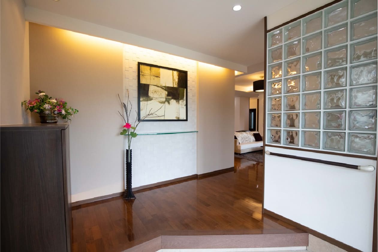 玄関を入ると目の前には間接照明があり、絵画や観葉植物がその場を盛り上げます。右側のガラスで出来た室内窓は向こう側の景色が透け、広々とした空間にみえます。玄関に手すりを付けることで、足腰悪い方やお年寄りの方にも出入りしやすい工夫をしています。