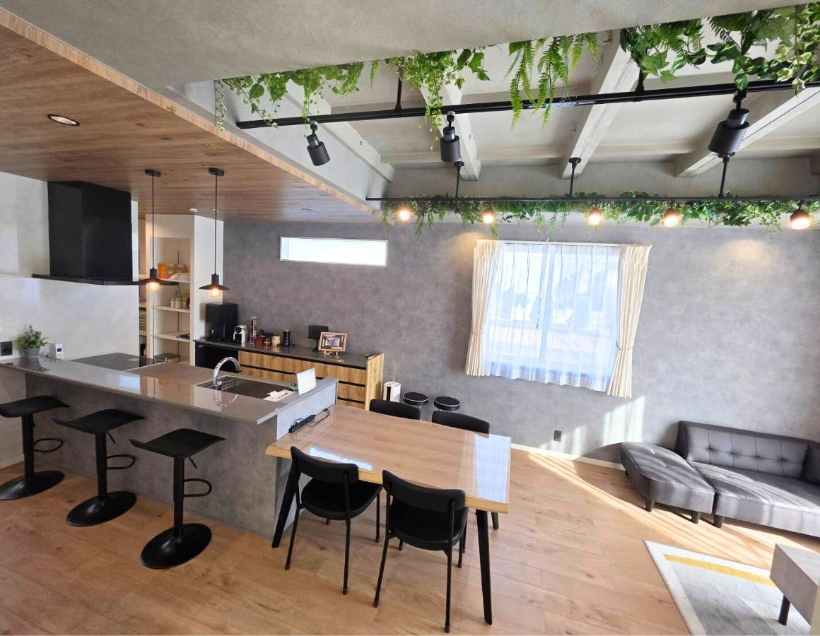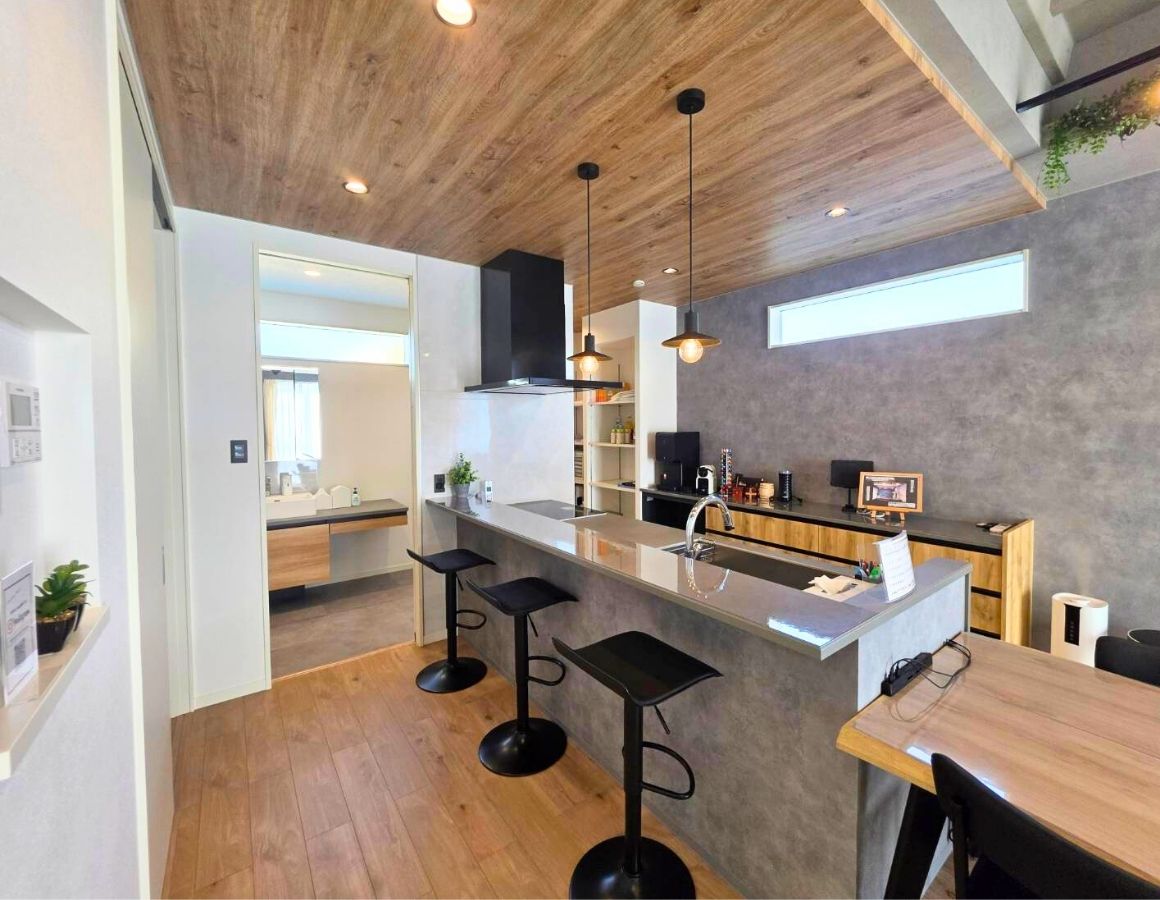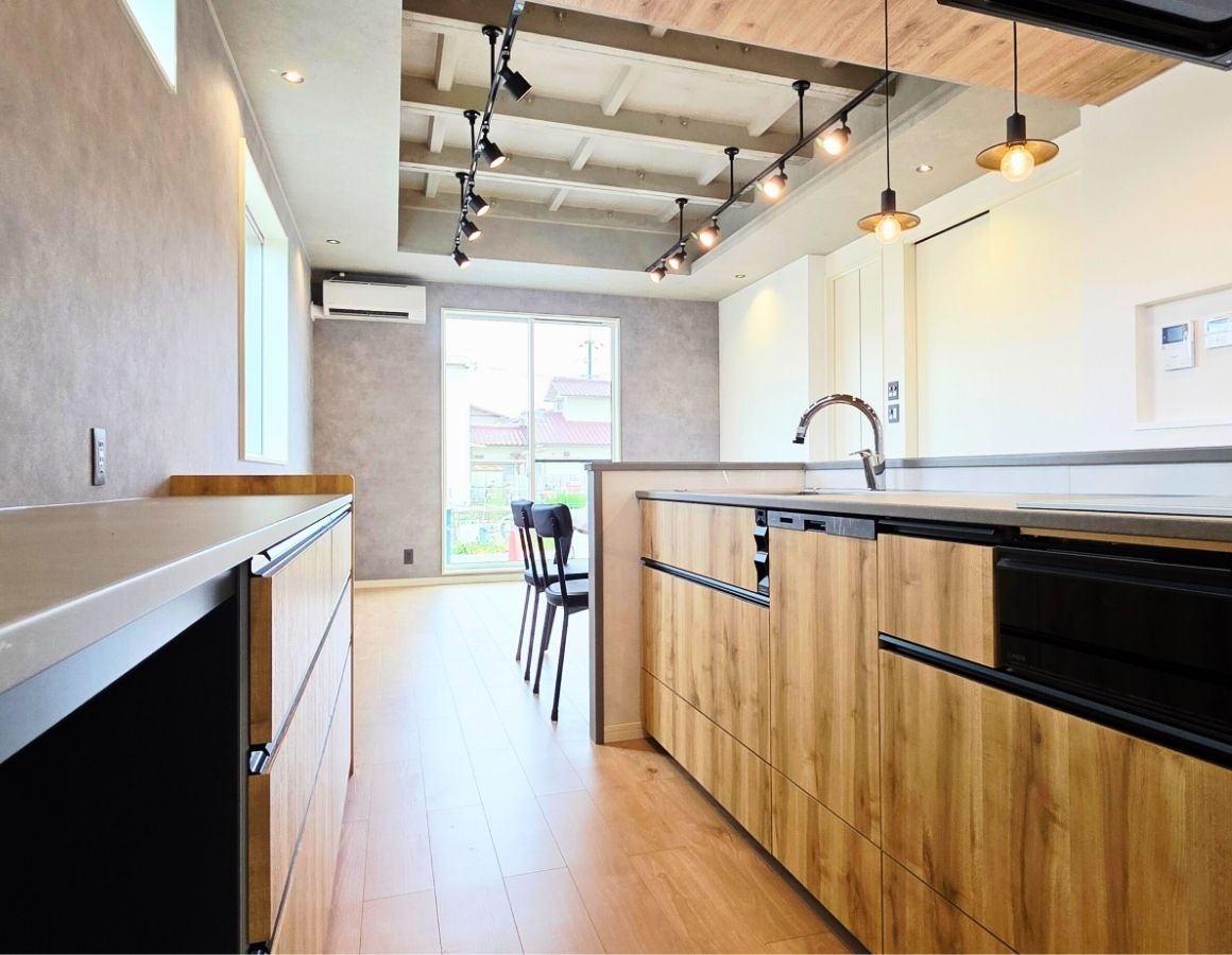 【開放的でおしゃれなスケルトン天井×木目キッチン】 無骨でスタイリッシュなスケルトン天井に、木目の温もりを合わせたキッチンスペース。無機質と自然素材のバランスが心地よい、家の中心となるLDKです。