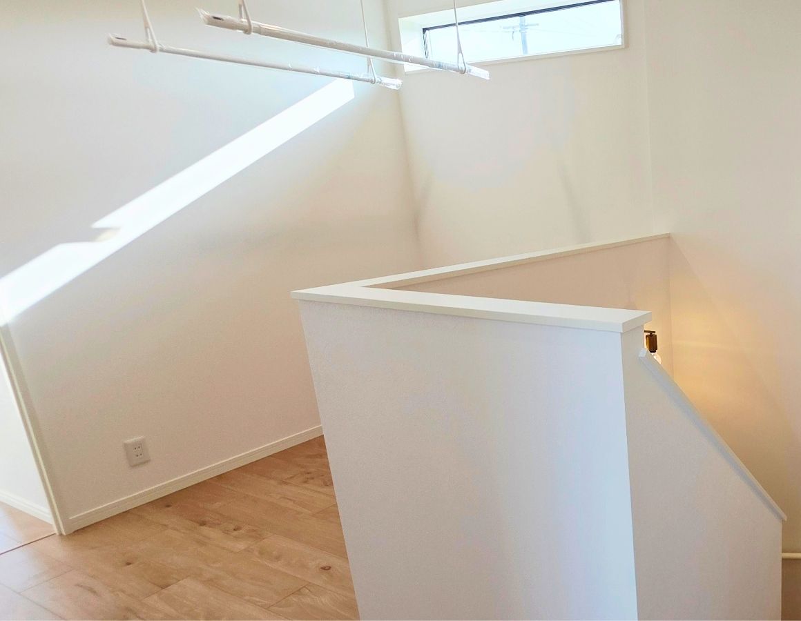 【階段上を活用した明るいランドリースペース】 2階ホールに設けた室内物干しスペースは、陽射しがたっぷり。 共働きや雨の日も安心、洗濯動線に配慮した「ちょっとラク」な工夫です。