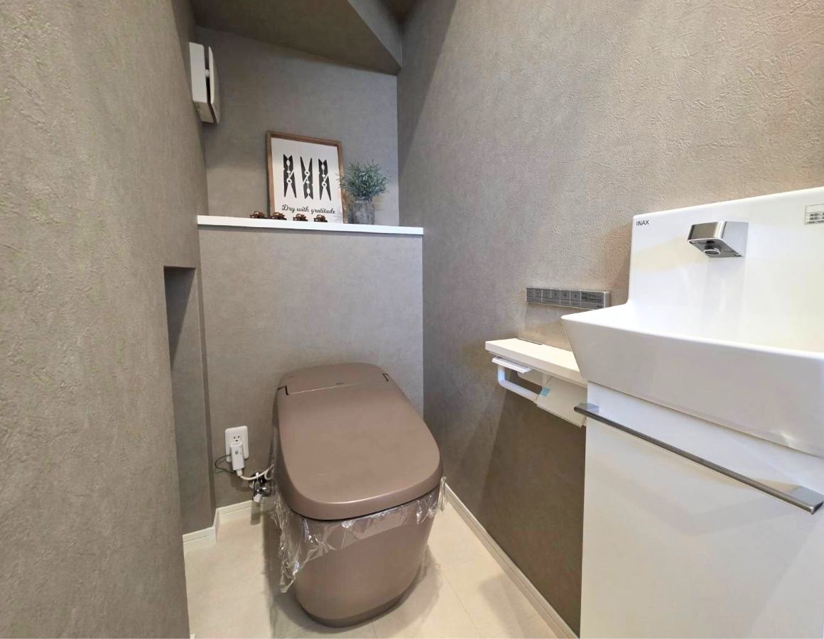【階段下のプライベートトイレ】 階段下の空間を、落ち着きのあるプライベートトイレに。素材感のあるクロスとやわらかな光が、心地よい雰囲気を演出します。背面カウンターには小物やグリーンを飾り、機能性とデザイン性を両立。