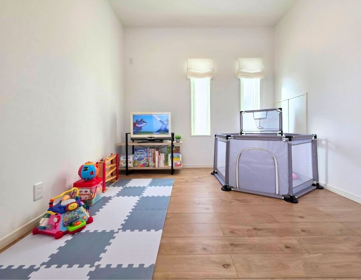 【リビング横に、4.5帖のキッズスペース】 リビングに隣接した4.5帖の一室をキッズスペースとして活用。 お子さまが遊んでいる間も、落ち着いてゆっくり内覧できます。家族みんなが安心して過ごせる、うれしい間取りです。