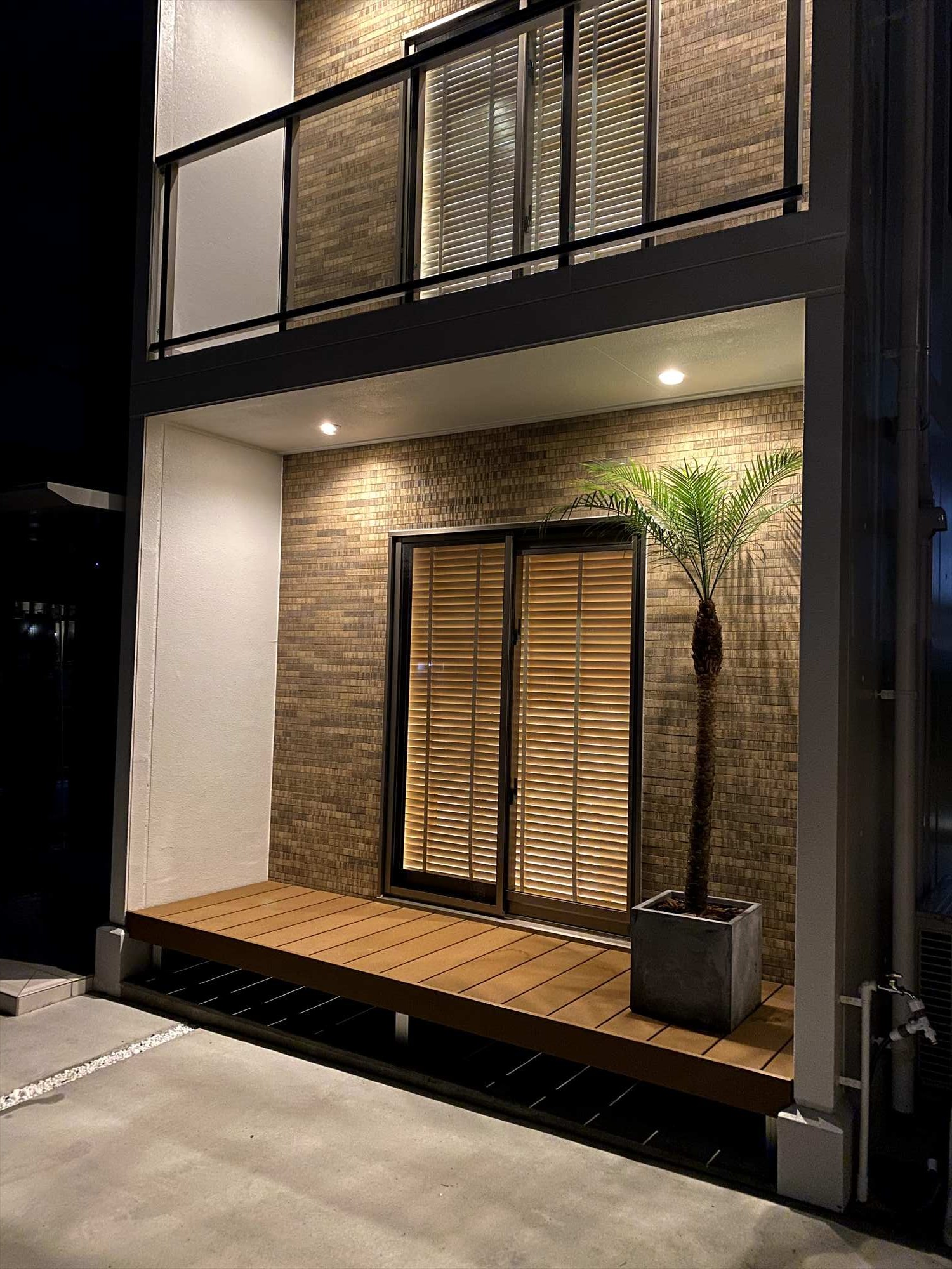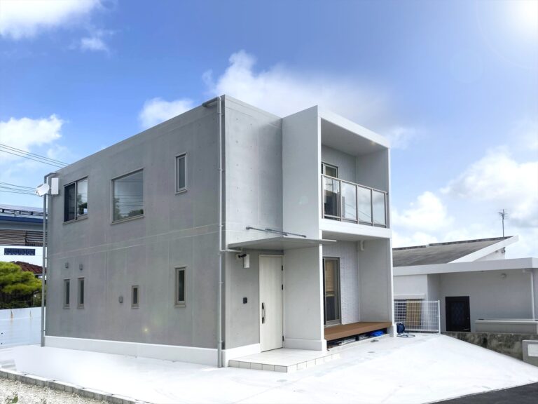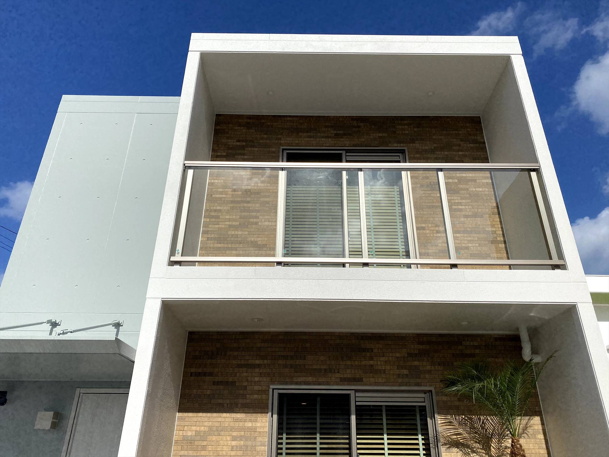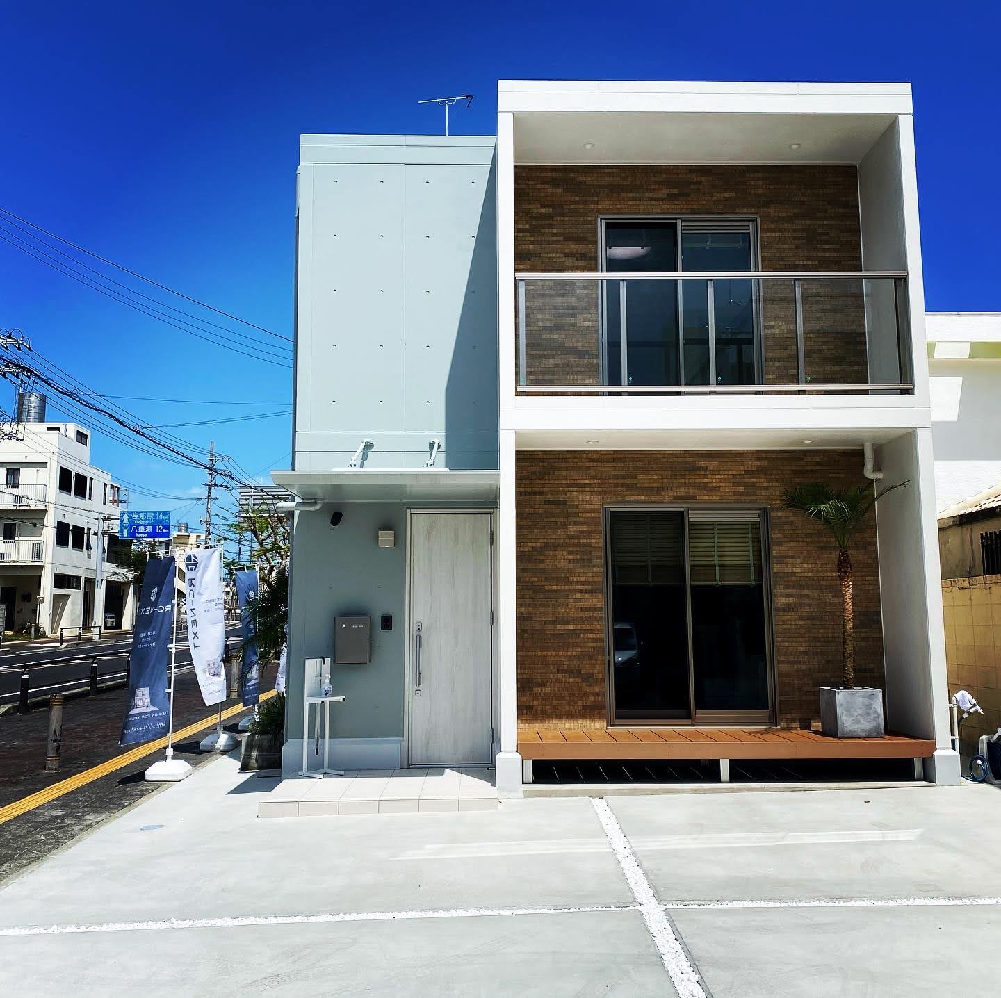 今回ご紹介する「糸満モデルハウス」の自慢は、3つの異なる色彩が織りなす圧倒的なデザイン性です。白いフレームにグレーの外壁、そしてアクセントのブラウンレンガ調タイルが、沖縄の街並みに洗練されたモダンな印象を与えます。