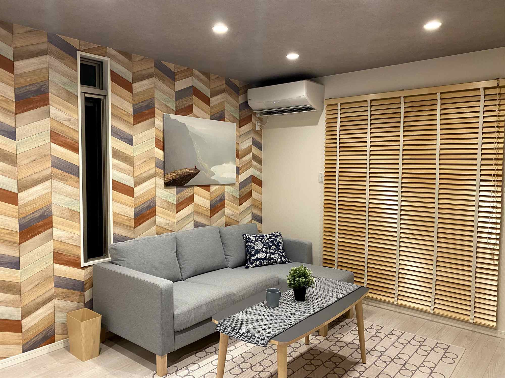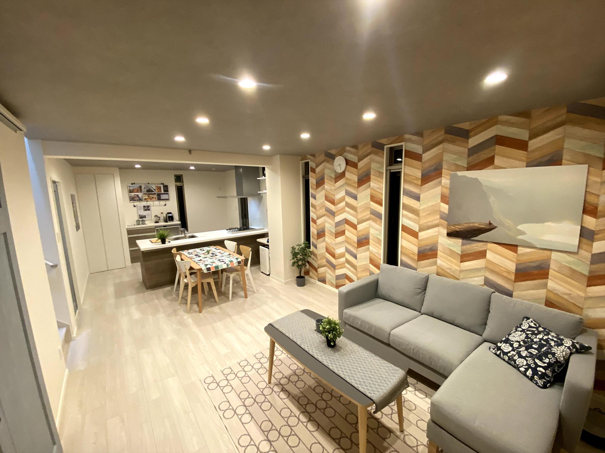 室内に入ると、目を引くヘリンボーン柄の壁が彩る、温もりとスタイリッシュさが調和した空間が広がります。3LDKというコンパクトな設計だからこそ、家事動線は効率的で、どこにいても家族の気配を感じられる優しい間取りになりました。