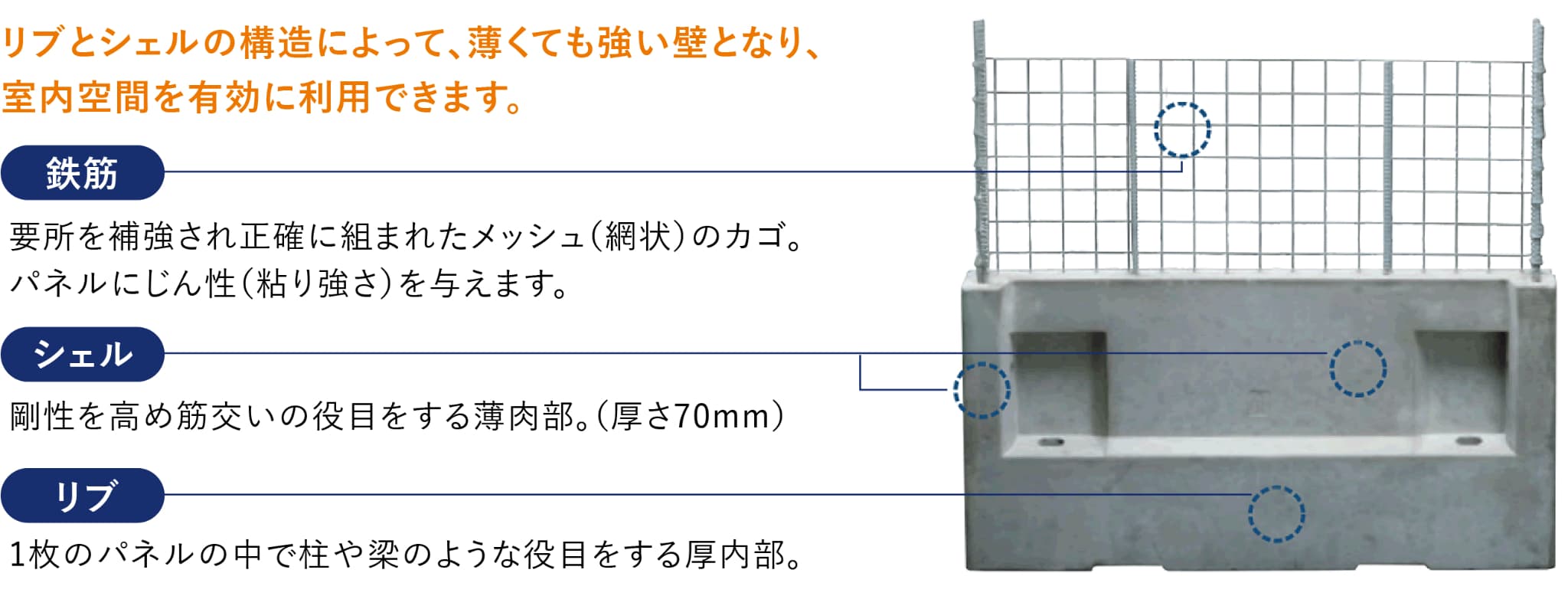 剛性を高め筋交いの役目をする薄肉部。(厚さ70mm)