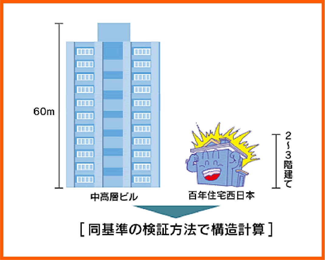 建物の構造には木造、軽量鉄骨造、コンクリート造などがありますが、異なる構造の建物を設計評価する場合、どうしても評価の考え方、安全率の掛け方が違ってきます。百年住宅西日本は2階建て、または3階建てですが、高さ31m超60m以下の中高層建築物にも適用される基準(限界耐力計算法)で構造計算を行っています。これは、地震などの力を受けた建築物に生じる変形や、部材に生じる力を計算により確認する、新たな構造計算手法です。それだけ散しい条件で検討されている百年住宅は、他構造の建物に比べて安全率が高い、つまり耐力に十分な余力がある安心設計であるといえます。